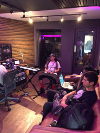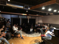 Participants gather around and listen to the new songs at the conclusion of BMI, Warner/Chappell and Warner Music Group “Write On” song camp at the Atlantic Records Studio in Los Angeles. View Photo
