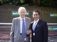 BMI’s Brandon Bakshi (r) smiles for the camera with legendary producer Sir George Martin on April 24 during the Nordoff-Robbins Race Day at Sandown Park. View Photo