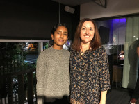 (L-R) Student Charu Balamurugan and mentor Cindy O’Connor pause for a photo during a recording session for the Uni Music Mentorship program. View Photo