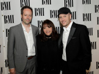 BMI composer Clinton Shorter, BMI’s Doreen Ringer Ross and BMI composer Andrew Lockington huddle for a photo on the red carpet at the 2012 BMI Film/TV Awards. View Photo