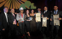 2009 Latin Awards, left to right: BMI’s Delia Orjuela; peermusic’s Ramon Arias; Scholarship winner Jose Luis Rodriguez; peermusic’s Kathy Spanburguer; BMI’s Del Bryant and Porfirio Pina View Photo