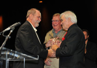Jim Rooney (center) and Dickey Lee (right) present the Leadership Music Dale Franklin Award to friend Allen Reynolds on Sunday, August 23 in Nashville. View Photo