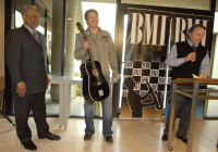 Tim Nichols, flanked by BMI’s Thomas Cain (left) and Jody Williams (right), shows off his new guitar at the party celebrating Faith Hill’s no. 1 “A Baby Changes Everything” Tuesday, March 3 in Nashville. View Photo