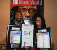 Sought-after wordsmith Makeba Riddick recently visited BMI’s New York office to collect her BMI Awards for co-penning T.I.’s “Live Your Life,” which topped Billboard’s Hot 100 and Hot Rap Song charts. Makeba’s ability to fuse thematic storytelling with genre-smashing beats has made her the “go-to” songwriter for recording artists seeking a distinctive sound. Pictured are BMI’s Wardell Malloy and Makeba… View Photo