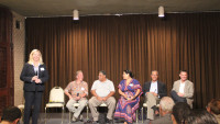 The crowd enjoys networking during the meet and greet reception prior to the lively panel discussion. View Photo