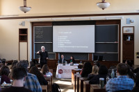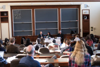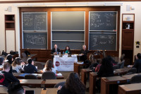 RAP President Jennifer Marr introduces the panel of speakers to the standing room only crowd in Harvard Law School’s Austin Hall. View Photo