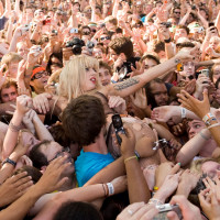 Lady Gaga surfs the crowd during Semi Precious Weapons’ performance on BMI’s Lollapalooza stage August 6 in Chicago. View Photo