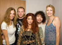 BMI’s Samantha Cox (far left) and Brandon Haas (second from right) catch up with Freelance Whales after their performance on the BMI/Lollapalooza stage August 8 in Chicago. View Photo