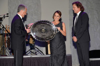BMI President Del Bryant and BMI Vice President, Latin Writer/Publisher Relations Los Angeles, Delia Orjuela present 2014 BMI President's Award recipient Carlos Vives with his award onstage during the 21st annual BMI Latin Awards at the Bellagio on March 11, 2014 in Las Vegas, Nevada. View Photo
