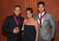 Miguel “Nacho” Ignacio Mendoza (L) and Jesus “Chino” Alberto Miranda Perez (R) of Chino & Nacho and BMI Vice President, Latin Writer/Publisher Relations Los Angeles, Delia Orjuela (C) arrive at the 20th annual BMI Latin Awards at the Bellagio on March 21, 2013 in Las Vegas, Nevada. View Photo