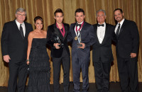 (L-R) BMI Senior Vice President, Writer/Publisher Relations Phil Graham, BMI Vice President, Latin Writer/Publisher Relations Los Angeles, Delia Orjuela, BMI Songwriter of the Year Award recipients, singer/songwriters Prince Royce and Horacio Palencia, BMI President and CEO Del Bryant and BMI Director, Latin Writer/Publisher Relations Los Angeles, Joey Mercado appear on stage at the 20th annual BMI Latin Awards at the… View Photo