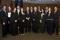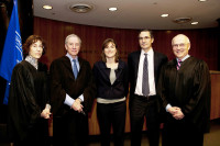 Judge Sandra Segal Ikuta, United States Court of Appeals, Ninth Circuit; Judge A. Raymond Randolph, United States Court of Appeals, District of Columbia Circuit; Hope Lloyd, BMI Attorney; Joe DiMona, Vice President, Legal Affairs; and Judge Richard C. Wesley, United States Court of Appeals, Second Circuit enjoy the 27th annual Cardozo/BMI Entertainment and Communications Law Moot Court Competition. View Photo