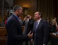 Michael O’Neill (right) greets BMI songwriter Lee Thomas Miller (left) after the music licensing hearing. O’Neill’s testimony proposed changes intended to modernize BMI’s consent decree to create a level playing field for BMI’s affiliated songwriters, composers and publishers. Miller testified on behalf of the Nashville Songwriters Association International. View Photo