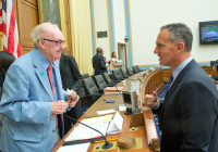 BMI’s Michael O’Neill (right) thanks House Judiciary IP Subcommittee Chairman Howard Coble (R-NC) (left) for hosting the hearing. This is the first of two hearings on music licensing being held this month. View Photo