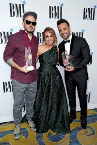 (L-R) Honoree Residente, BMI Vice President of Latin Music Delia Orjuela, and honroee Luis Fonsi attend the 25th Annual BMI Latin Awards at Regent Beverly Wilshire Hotel on March 20, 2018 in Beverly Hills, California. View Photo