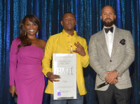 BMI Vice President of Writer/Publisher Relations Catherine Brewton (L) and host Kenny Burns (R) present recording artist Chauncey "Hit-Boy" Hollis (C) with a BMI Special Citation of Achievement recognizing 'Great National Popularity as Measured by Broadcast Performances' of his song 'Clique' at the 2014 BMI R&B/Hip-Hop Awards at the Pantages Theatre on August 22, 2014 in Hollywood, California. View Photo