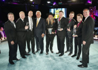 The night’s big winners gather for a photo at the 2013 BMI Country Awards in Nashville. Pictured are (l-r): BMI's Jody Williams; Sony Music Publishing's Troy Tomlinson, Danny Strick, and Martin Bandier; BMI Icon Dean Dillon; Songwriter of the Year Rodney Clawson; Song of the Year Honorees Troy Verges and Hunter Hayes; and BMI CEO Michael O'Neill. View Photo