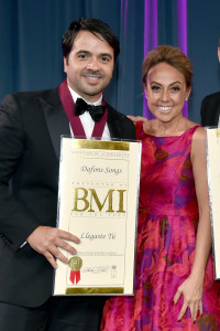 Honoree Luis Fonsi (L) poses with award and BMI Vice President, Writer/Publisher Relations, Latin Music Delia Orjuela onstage during the 2016 BMI Latin Awards on March 2, 2016 in Beverly Hills, California. View Photo