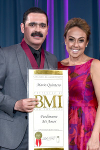 Honoree Mario Quintero (L) poses with award and BMI Vice President, Writer/Publisher Relations, Latin Music Delia Orjuela onstage during the 2016 BMI Latin Awards on March 2, 2016 in Beverly Hills, California. View Photo