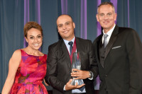 (L-R) BMI Vice President, Writer/Publisher Relations, Latin Music Delia Orjuela; honoree Jesus Omar Tarazon; and BMI President and CEO Mike O’Neill pose onstage during the 2016 BMI Latin Awards on March 2, 2016 in Beverly Hills, California. View Photo