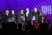 BMI President and Chief Executive Officer Michael O’Neill (3rd from R) and BMI Vice President, Writer/Publisher Relations, Latin Music, Los Angeles, Delia Orjuela (R) present the BMI Icon Award to honorees (from L) Louie Perez, Conrad Lozano, Steve Berlin, and David Hidalgo of music group Los Lobos onstage during the 24th Annual BMI Latin Awards at the Beverly Wilshire Four… View Photo