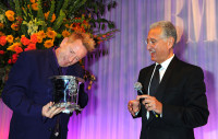 John Lydon receives the BMI Icon Award from BMI President Del Bryant at the 2013 BMI London Awards View Photo