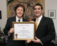 BMI’s Executive Director, Writer/Publisher Relations, Europe and Asia, Brandon Bakshi presents Sir Paul McCartney with a BMI Million-Air Award for his song “Live and Let Die” before the 2012 BMI London Awards. The iconic James Bond theme has racked up over 4 million performances. View Photo