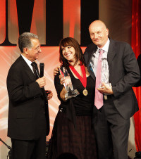 BMI's President & CEO Del Bryant; 2009 Robert S. Musel Award and College Song winner for “Pocketful Of Sunshine," songwriter Danielle Brisebois; and Guy Moot, Managing Director, EMI Music Publishing, UK. View Photo
