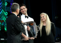 BMI President & CEO Del Bryant (L) and BMI Vice President & General Manager, Writer/Publisher Relations Barbara Cane (R) present singer/songwriter Adam Levine with the 2013 BMI President's Award at the 2013 BMI Pop Awards. View Photo