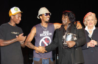 Pharrell Williams, Dallas Austin, James Brown and BMI's Frances Preston at BMI's 2002 Urban Awards in Miami. View Photo