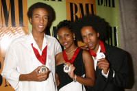 BMI Songwriters Tre'vant J. Hardson, Nastacia Cherise Kendall, and J-Sw!ft show off their medallions. View Photo