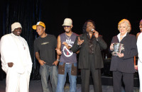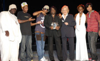 Rodney Jerkins, Pharrell Williams, Dallas Austin, James Brown and BMI's Frances Preston at BMI's 2002 Urban Awards in Miami. View Photo