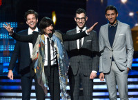 Producer Jeff Bhasker with musicians (L-R) Nate Ruess, Jack Antonoff and Andrew Dost of fun. accept Song of the Year award for "We Are Young" onstage at the Grammy Awards at the Staples Center. View Photo