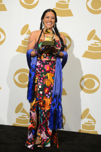 Lila Downs, winner of Best Regional Mexican Music Album, is all smiles in the press room during the 55th Annual GRAMMY Awards. View Photo