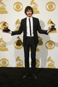 Gotye celebrates his three Grammy wins in the press room during the Grammy Awards at the Staples Center. View Photo