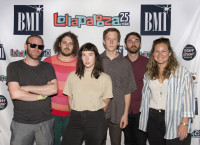 BMI’s Justin Seiser (L) Samantha Cox, Tim Pattison and Nina Carter (R) smile for a group shot with BMI singer/songwriters LANco. View Photo