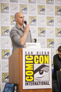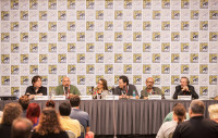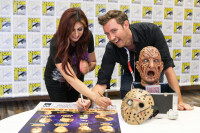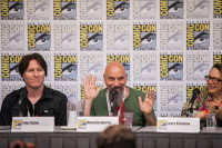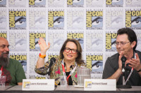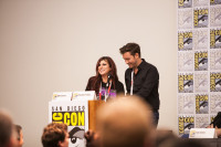 Co-moderators and producers of the panel Anne Cecere of BMI and Chandler Poling of Krakower Poling PR sign exclusive Comic-Con posters to celebrate their 5th year of collaborating. View Photo