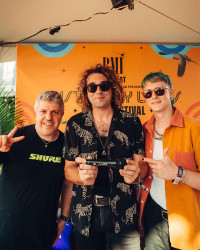 Shure’s Yuri Lysoivanov poses with LVVRS after gifting an engraved microphone to the band ahead of their BMI Stage at ACL Fest debut. View Photo
