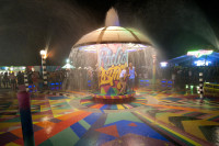 Radiate Positivity, part of the Bonnaroovian Code, is painted on the fountain near the Miller Lite New Music on Tap Lounge at Bonnaroo Music Festival in Manchester, TN. View Photo