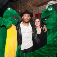 BMI songwriter Chancellor Warhol poses with BMI’s Brooke Ivey and a couple of frogs during round 1 of Round to Bonnaroo. The frogs passed out ballots, hyped the crowd and kept everyone laughing during the event. View Photo