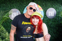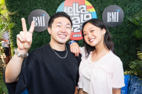 Ava Maybee and BMI affiliate Chad Smith of Red Hot Chili Peppers pose backstage in the BMI Lounge at Lollapalooza in Chicago, IL on August 2, 2024. View Photo