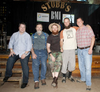 BMI's Bradley Collins (far left) and Mark Mason (far right) huddle for a photo with the Ben Miller Band at BMI's Howdy Texas party. View Photo