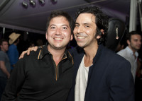 BMI SXSW showcase performer David Garza (right) and his brother Raul Garza huddle for a photo. View Photo
