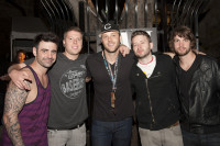 BMI's Traci Verlinde (far left), Tavi Shabestari (kneeling, right) and Casey Robison (far right) pause for a photo with Youngblood Hawke at BMI’s Thursday night SXSW showcase. View Photo