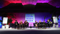 Pictured (L-R) BMI’s signature panel “How I Wrote That Song” featured top Latin urban producers Young Martino, Haze, Talento Uno Music’sGustavo Lopez, BMI’s Delia Orjuela, Tainy, Nely and Luny, during Billboard Latin Music Week at the Venetian Hotel in Las Vegas on April 24 View Photo