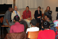 Fifteen students who participate in the Youth Recording Apprentice Program at the George Gershwin Junior High School visited BMI’s New York office on April 7 for a discussion about performing rights. BMI’s Ian Holder led the conversation, which ranged from compulsory licenses to Lady Gaga. Pictured are BMI’s Wardell Malloy, Porfirio Piña, Ian Holder, Samantha Cox and Brooke Morrow. View Photo