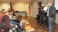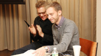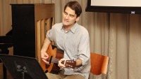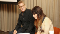 Billy Seidman and Stephie Coplan listening to playback of her song View Photo