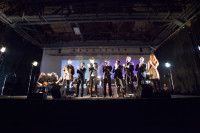 Pictured on stage at The Echo Society “Winter” concert are (L-R): Rob Simonsen, Joseph Trapanese, Brendan Angelides, Judson Crane, Jeremy Zuckerman, Nathan Johnson, Benjamin Wynn and Faux Fix. View Photo