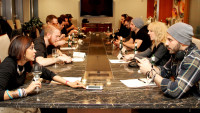 After listening to each others’ music, songwriters in the Speed Dating workshop begin the collaboration process. View Photo