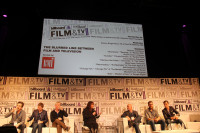 Pictured during the “The Blurred Line Between Film and Television” panel (L–R): Composers discussing dynamics of balancing scoring for high-end TV shows and film. View Photo